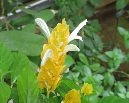 「鬱金珊瑚花」と書く。学名:Pachystachys lutea. 英名:Golden shrimp plant. きつねのまご科ぱきすたきす属。中南米、西インド諸島原産の非耐寒性常緑低木。国内では温室栽培。花期は初夏から秋。黄色い紡錘状の苞から白い舌のような花を咲かす。chromen系Chrysin(NO産生増強による血管拡張作用)等含有。(hy)